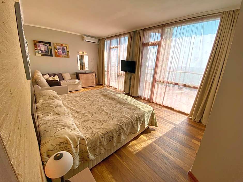 Studio is 452 square feet and includes 3 single beds 80-130 width plus a sofa bed plus balcony, extra beds on demand, and hairdryer.